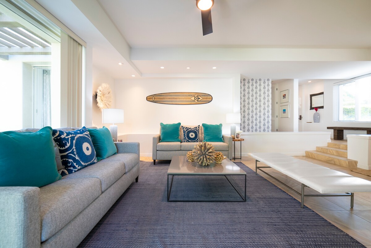 Stunning 100K Recent Reno+New Decor for a Hawaiian Beach Vibe. Wailea is one of the most sought after resort addresses on Maui.Here you can relax in the luxury of the beautiful grounds+refreshing swimming pool+spa. World Class Golf+Shopping. Ground flr condo with private wrap around lanai. King Master Bed with a contemporary private bath,2 Uber deluxe pull out Queen bed couches.Short stroll to Keawakapu Beach from condo where you can snorkel or take long tropical beach walks.BOOK UP TO 365 DAYS