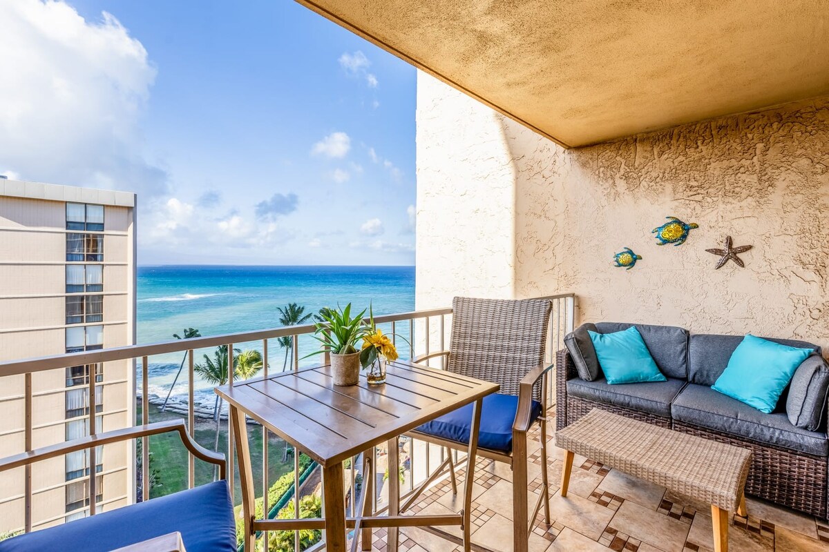 Välkommen till min lägenhet vid havet Njut av fantastisk havsutsikt och hisnande solnedgångar över de närliggande öarna. Se och hör havet från din säng och din privata lanai. Med en bekväm dubbelsäng, central luftkonditionering, 55" smart-TV, snabbt Wi-Fi, ett fullt utrustat kök och tvättstuga i enheten. Parkering på plats tillgänglig (18 USD/dag + skatt). Inga hotellavgifter, inga andra extra avgifter. Beläget på 10:e våningen på Royal Kahana by Outrigger (Napili-Honokowai/Kahana)