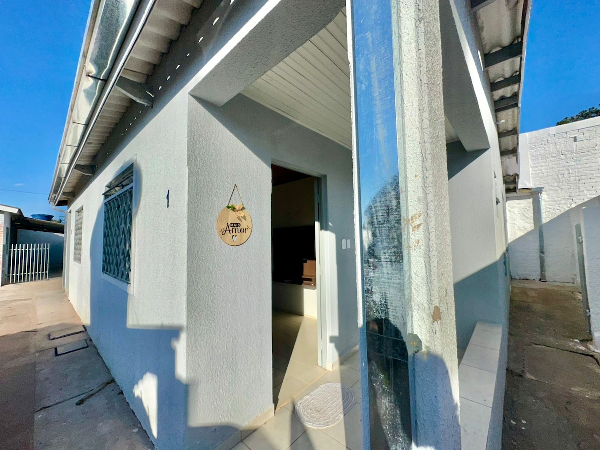 Beläget i ett lugnt grannskap, 2,5 km från shopping china, med apotek och stormarknad. Det erbjuder sängkläder, handdukar och badlakan. Det har internet, varm/kall luftkonditionering i rummen, automatisk tvättmaskin, elektronisk grind med täckt garage, TV43" med slutna kanaler. Köket är komplett, med redskap som rostfria kastruller, mikrovågsugn, smörgåsgrill, kaffebryggare, mixer, etc. Plats: Rua Adalberto Fróes, 174 Casa 2, Bairro Altos da Glória -Ponta Porã - MS.