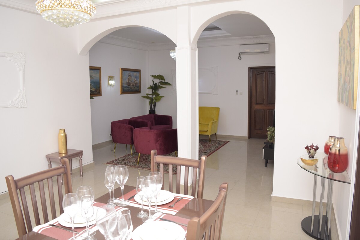 • Fantastisk lägenhet fullt möblerad, inom två sovrum, ett vardagsrum, ett pentry, ett badrum och moderna toaletter. • Det har en stor 55" QLED-skärm med Netflix och WiFi-anslutning. • En dag- och nattvakt, en städtjänst dygnet runt, säkrad av ett larmsystem och ett elektriskt staket samt övervakningskameror. • En elektronisk generator vid strömavbrott, en vattenbatch och en privat parkering.
