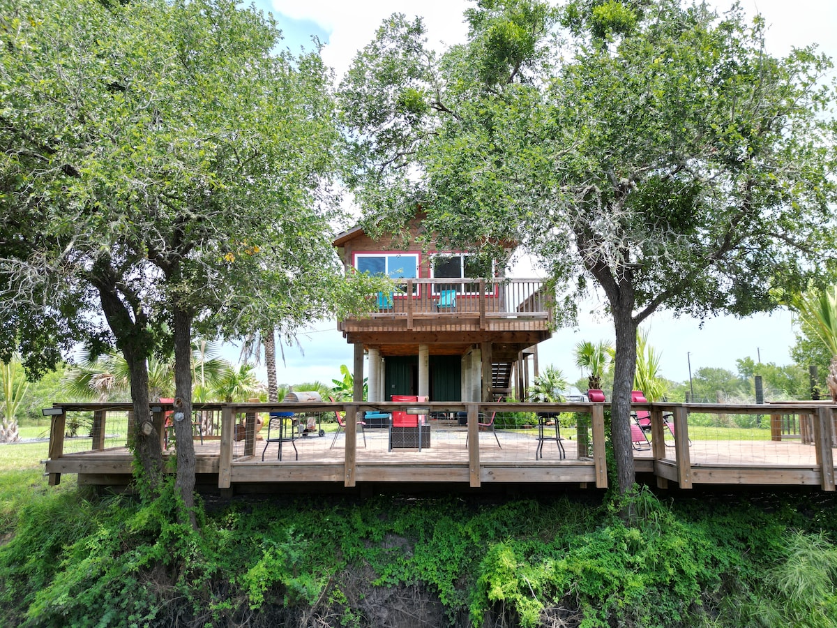 Pittoresk 1BR (queen) gäststuga precis vid vattnet. Beläget på 4+ hektar med 450' fasad på Copano Bay. Privat brygga, strand, fiske, kajakpaddling och spektakulära solnedgångar. Det "lilla huset" ligger bredvid ett större boende som sällan används. Helt ombyggt efter orkanen Harvey, inklusive nya golv och fönster. Minuter från restauranger, mataffärer, offentlig båtramp och Rockport Beach. En enkel 20 minuters bilväg till Port Aransas för djuphavsfiske.