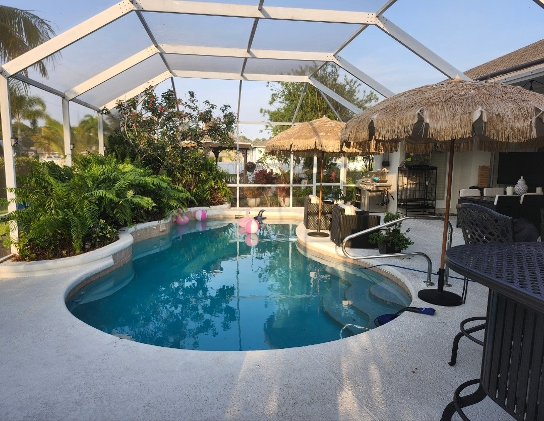 Lanai Living är ett charmigt enfamiljshus som erbjuder fantastisk utsikt över kanalen, en privat pool och en expansiv lanai. Denna tillflyktsort med 3 sovrum och 2 badrum ligger inbäddad i ett lugnt bostadsområde, perfekt för fridfulla promenader och cykelturer, och är bekvämt belägen inom 10 miles från Jensen Beach och Stuart. Oavsett om du är ute efter en lugn tillflykt eller en aktiv semester vid kusten, har detta boende allt du behöver för att varva och njuta av Floridas livsstil.