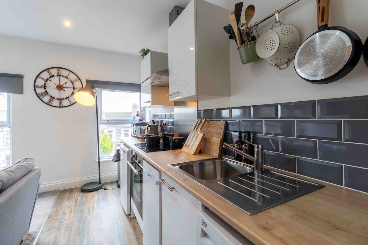 Superhost - Privat översta våningen fristående/fristående lägenhet - kök/vardagsrum - sovrum/vardagsrum - M/våg, kylskåp/frys. ALTERNATIV MED 1 ANNAT SOVRUM OCH DEDICERAT BADRUM på 1:a våningen för ENSAM ANVÄNDNING av bokningsgruppen endast och INGÅR I BOKNINGSPRISET Endast en grupp per besök, om de extra rummen inte behövs förblir de tomma. Bottenvåningen kök/matplats, vardagsrum, uterum & trädgård kan vara tillgängliga. Fiber WIFI, SkyQ, Netflix Parkering på privat bilresa utanför