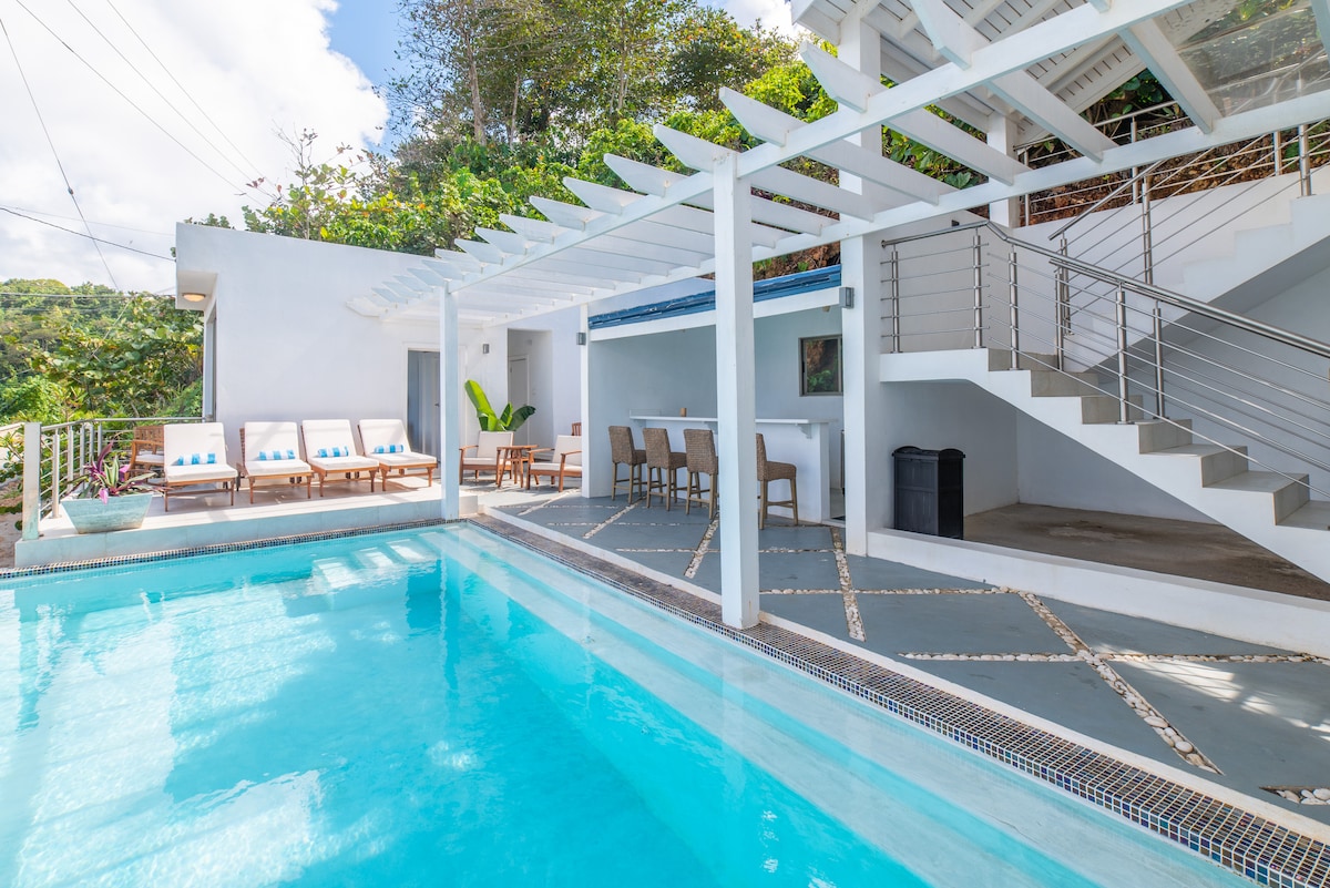 En lugn tillflyktsort inbäddad i bergen i Passley Garden. Vägen till vår fastighet är brant och stenig, vilket kräver ett 4-hjulsdrivet fordon. Vår villa är en del av en holistisk, miljövänlig verksamhet, omgiven av frodiga tropiska växter och erbjuder en delvis utsikt över Port Antonio. Ett privat trädäck, komplett med en cabana och pool uteslutande för våra gäster. Observera att villan inte inkluderar ett fullt utrustat kök med apparater. Vänligen läs vår fullständiga beskrivning och våra omdömen.