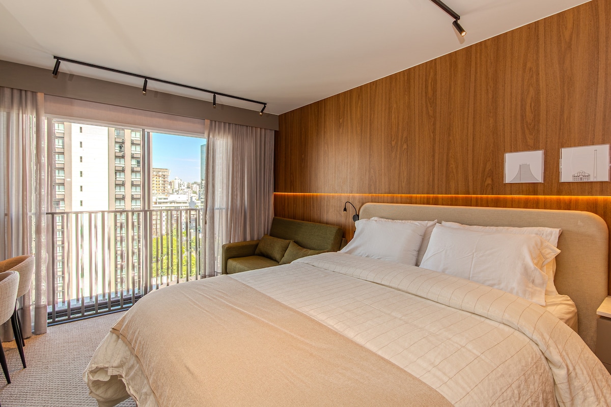 Modern och mysig studiolägenhet, inredd av en arkitekt, på en hög våning, med vidsträckt utsikt över staden, i ett säkert och lugnt område. Perfekt för arbete eller fritid – här finns snabbt Wi-Fi, smart-TV, queen-säng med mörkläggningsgardiner, bäddsoffa, luftkonditionering, skåp och ett funktionellt kök med dubbel minibar. Badrum med uppvärmd handdukshängare, kraftfull dusch och hårtork. Byggnad med gym öppet dygnet runt, termalpool, takterrass och tvättmöjligheter. 850 meter från Parcão.