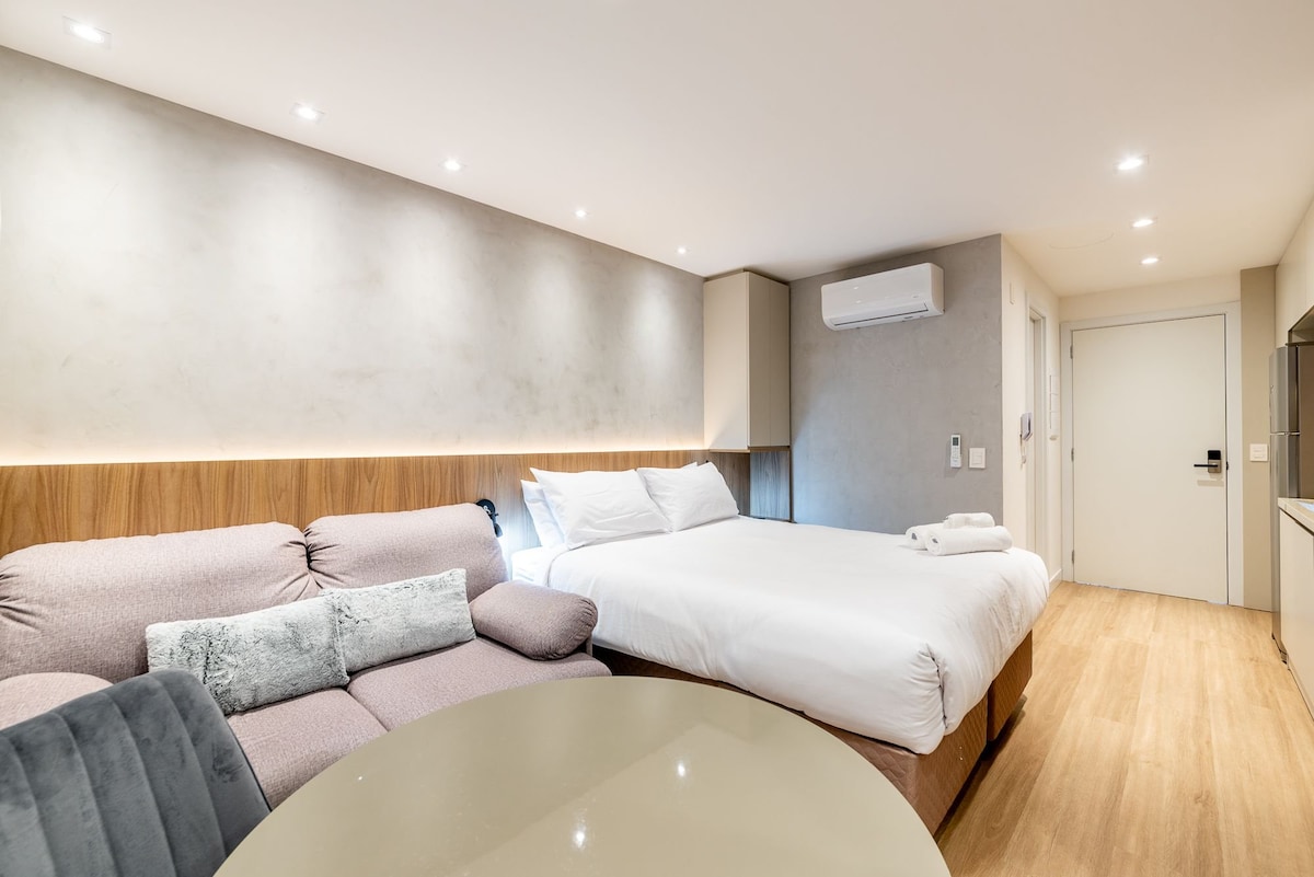 Koppla av i detta charmiga, lugna och eleganta utrymme och utmärkt läge. Modern och elegant lägenhet med 1 sovrum, 49m ², i Pulse 129-byggnaden, fritidsområde, balkong, luftig, 350 mega internet, stol och bänk, virtuell concierge dygnet runt, självincheckning, parkeringsplats, gym, luftkonditionering, 60" smart TV med Netflix, etc., grill, elektrisk ugn och konvektion (luft-frys), strykjärn, mikrovågsugn, vattenfilter, elektrisk spishäll, elektroniskt lås, hårtork, tvättmaskin LG.