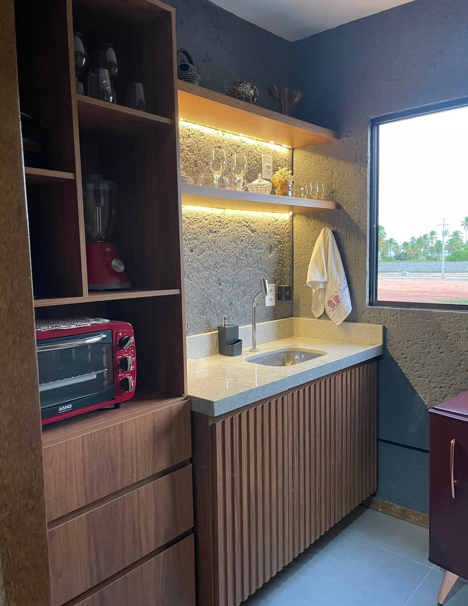 En studio utformad för vår familj med: - Tempori planerade möbler med sluten garderob - Italiensk bäddsoffa - Vardagsrum med bord för inomhusmåltider med skiljevägg för badrum och kök som innehåller alla hushållsredskap - Balkong med professionell grill, matbord utomhus - Hushållsartiklar - Luftkonditionering 22 tusen btus - Full Enxoval -ortina blackout - wifi - Smart-tv - 2 strandstolar till ert förfogande - Desinfektion av kackerlackor och myror