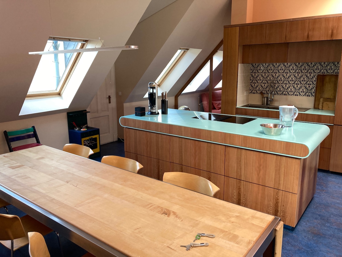 Högt uppe i det gula hörnhuset vid parken: Många kvadratmeter och möjlighet att rymma upp till 12 gäster gör att du kan erövra och fira Berlin med hela familjen och vänner härifrån! En målningsstudio på vinden, byggd av dig själv. Vi är konstnär och designer och har monterat en målarsal, ett sovrum, ett stort kök-vardagsrum, ett hälsobadrum och ett gäst- och spelrum. Det här är ditt ställe!