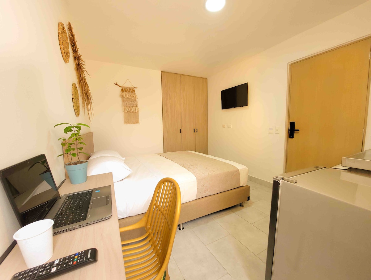 - Privilegierat läge: i hjärtat av Laureles-distriktet, nära tunnelbanestationer, stadion, stormarknader, restauranger och 70. - Wifi (300mb) Fiberoptik. - Luftkonditionering - Privat jacuzzi - Privat badrum - Hiss - Personal på plats dygnet runt, redo att hjälpa till med allt du kan tänkas behöva. - 43" Smart TV, med appar installerade. - Kök utrustat med porslin, kastruller, skedar, knivar. - Queen size-säng (1,60 m x 1,90 m) - Transparenta priser (se regler)