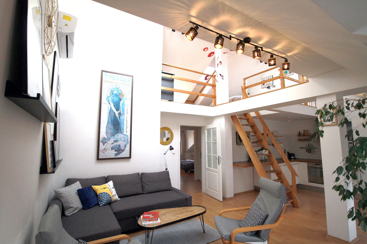 Sällsynt pärla i Prag – gästfavorit på Airbnb. Begränsad tillgänglighet; vanligtvis fullbokat. * Förtrollande gömställe i Prag * Renoverad vindsvåning med gångavstånd till centralt läge * Perfekt för par, ensamresenärer eller arbete * Höghastighets-WiFi och Smart-TV med Netflix * Fullt utrustat kök * Linne, handdukar och toalettartiklar tillhandahålls * Spiraltrappor leder till drömlikt sovrum med dubbelsäng * Badrum med dusch * Luftkonditionering och fläktar * Tunnelbanelinje A (Grön linje) Namesti Miru - 2 minuters promenad