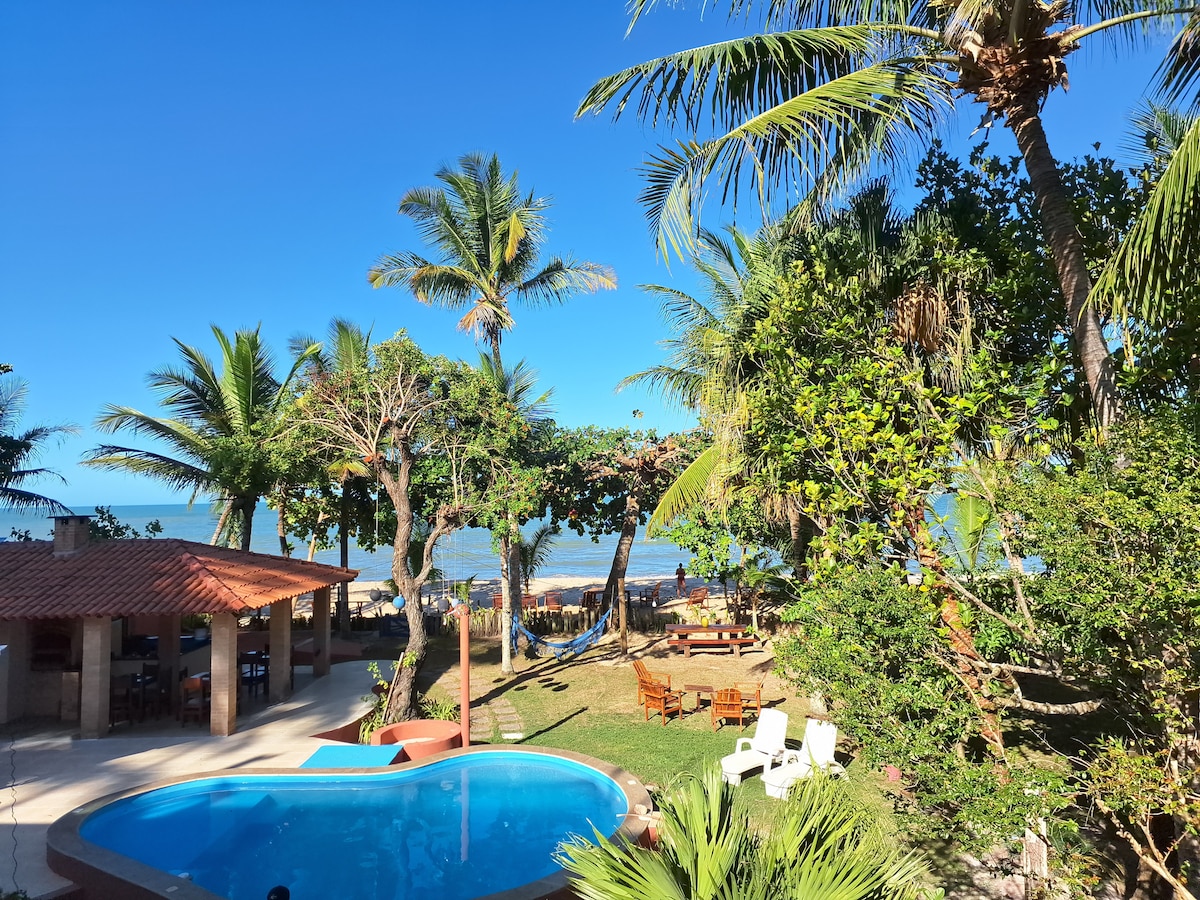 I Cumuruxatiba på klippan vid havet, på 9 000 m2, har vi stugan med 2 sviter, i mitten av trädgården med kök på balkongen ( spis, kylskåp, bärbar grill, mikrovågsugn), 80 m från huvudhuset av 5 sviter mot havet, bredvid stugan finns en extra dubbelsvit som kan hyras separat. Banan, kiosken och poolen är delad användning, huvudhuset är begränsad användning. Allt gjordes med tillgivenhet för att njuta av den vackra utsikten!