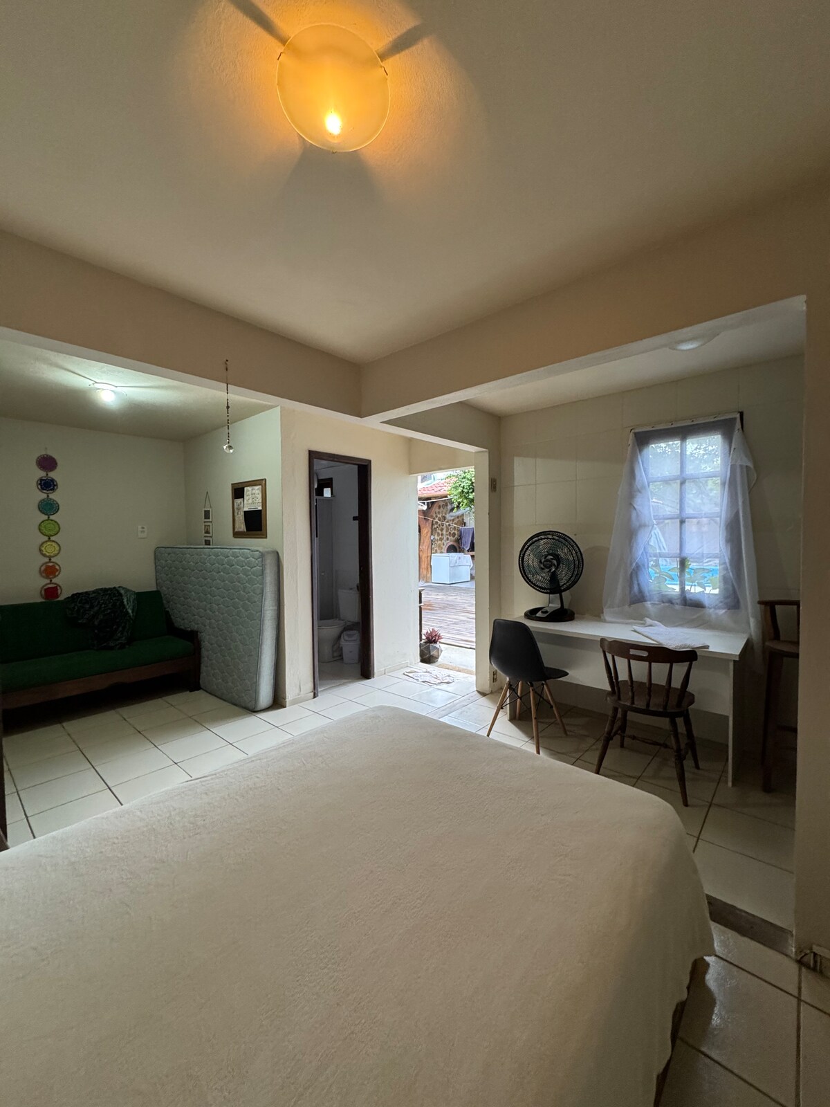 Ambiente acolhedor e tranquilo, ideal para quem busca descansar e desacelerar. 🌿 A suíte conta com TV Smart, ventilador e frigobar. Destaque para a varanda privativa com rede, mesa e cadeiras, criando um espaço perfeito para relaxar. Também contamos com uma cozinha compartilhada completa para uso dos hóspedes. Área externa com piscina e ambiente agradável. Localização a cerca de 10 minutos do centrinho do Rosa e do Pico da Tribo. Estacionamento gratuito dentro da propriedade.