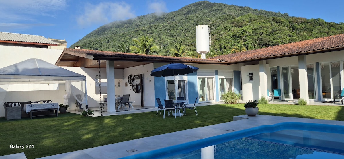 Nytt hus av hög standard, på Praia da Lagoinha i lägenheten i Salga i Ubatuba, med 24-timmars säkerhet. Framför stranden, bara tvärs över gatan, praktiskt taget på sanden, nära den berömda 7-strandsleden! Med 6 rymliga sviter med luftkonditionering, jacuzzi med varmt vatten, pool, fullt utrustat kök och integrerat gourmetområde med grillplats och pool. Den har en terrass med fantastisk havsutsikt. Det har alla väsentliga hushållsartiklar, Wi-Fi och streamingtjänster.