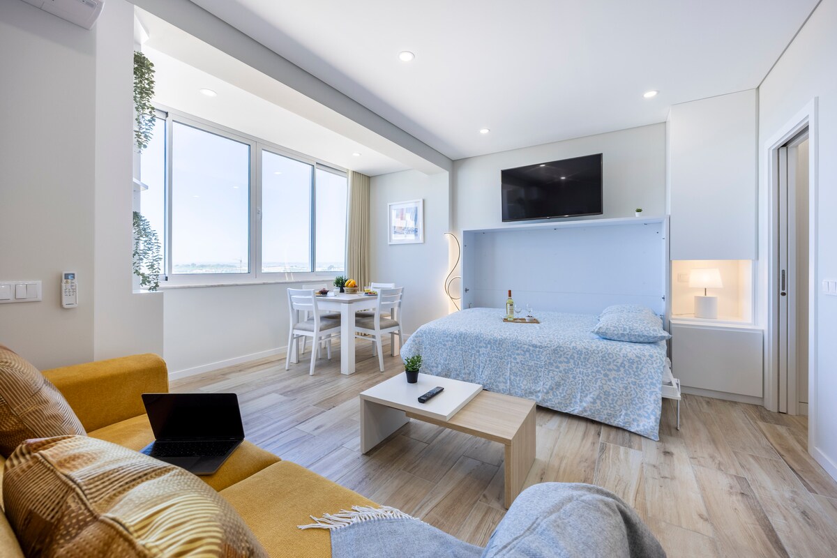 Denna öppna planlösning T0 Lägenhet har renoverats, möblerats och byggts om. Fullt utrustad med kapacitet för 3 personer men bäst lämpad för 2 personer. Bra läge på frontlinjen bara 50 meter från stranden. Stor balkong på 8 kvadratmeter med fantastisk havsutsikt från alla håll, med två stolar, ett bord, parasoll etc. Dubbelsängen har en helt ny ortopedisk madrass!