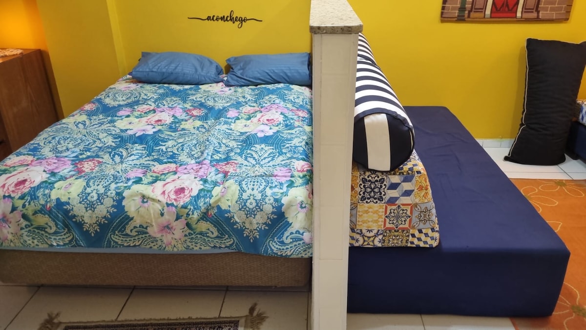 Enkel lägenhet, belägen i stadsdelen Gonzaguinha, nära stranden, VLT, stormarknader, barer, snackbarer, bensinstation och sjukhus. Fastigheten ligger 3 minuters promenad från Gonzaguinha-stranden i São Vicente. Det ligger också 8 minuter med bil från Shop Brisamar. Du kan bara komma in med tillstånd!! Vi har kylskåp, hårtork, fläktar, dricksvattenfilter, kylskåp, kastruller, mikrovågsugn, elspis, köksredskap, smart-TV, internet, schampo och tvål. Slutligen är lägenheten 220w.