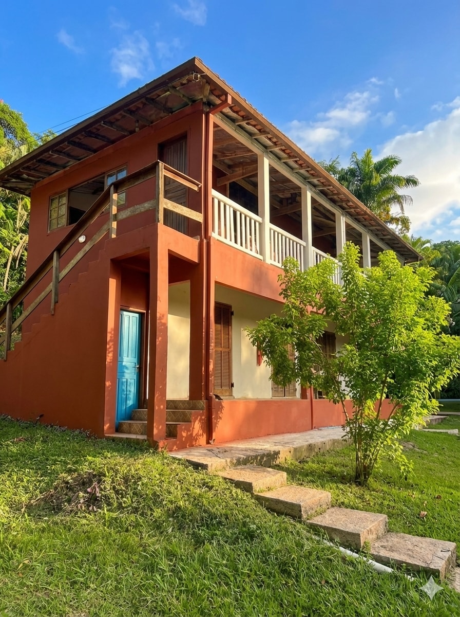 Huset är en grön bit som delas med många tiaras, trädskattor, bem-te-vis och hackspettar. Den har 210 meter långa fall och brunnar. Vårt vatten kommer från källan och är drickbart. Detta hus föddes ur en barns dröm. Min farfar var murare och jag lärde mig att bygga med honom. Här är början på en lång resa av berättelser. Stunder som jag bygger och lagrar minnen av ett liv som styrs av omsorg för naturen och skapandet av drömmar. Känn dig fri att komma in i denna helgedom.