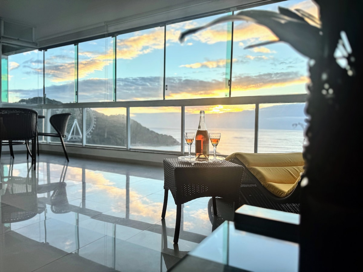 Lägenhet i Home Club Condominium vid havet, med pooler och olika fritidsalternativ. Den ligger 15 minuters bilresa från Beto Carrero Park. Du kommer att ha tillgång till en svit med luftkonditionering och dubbelsäng, ett rum med dubbelsäng och det andra med tre enkelsängar, alla med luftkonditionering. Lägenhetens kök är välutrustat med vitvaror och redskap. Balkongen har en grillplats och havsutsikt En parkeringsplats och sängkläder och handdukar ingår.