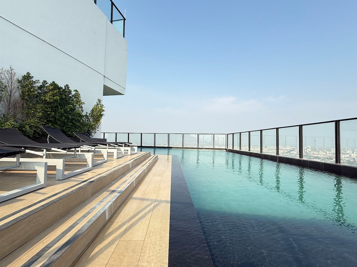 Rama9市中心~无边泳池~高速wifi~超大落地窗~复式阁楼
