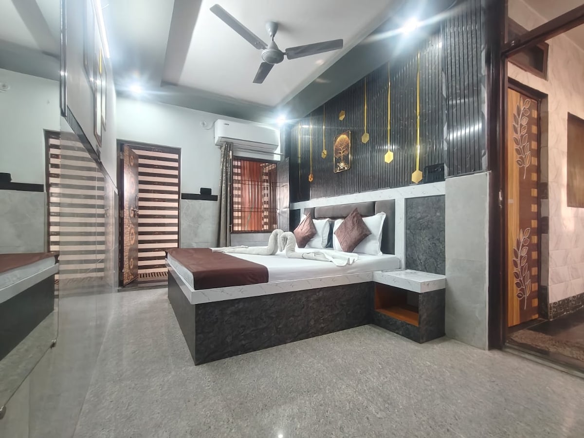 Bo på Bhakti Vanam, bara 1,5 km från den heliga Prem Mandir i Vrindavan. Njut av en rymlig studio med luftkonditionering, höghastighets Wi-Fi, egen ingång och en mysig balkong. Perfekt för två gäster, med en extrasäng tillgänglig vid behov. Bekvämt till tempel och kollektivtrafik, och scootyuthyrning kan ordnas. Fullständig tillgång till ett välutrustat kök och rent tvättrum. Perfekt för familjer eller ensamresenärer som söker komfort och frid på en andlig plats.