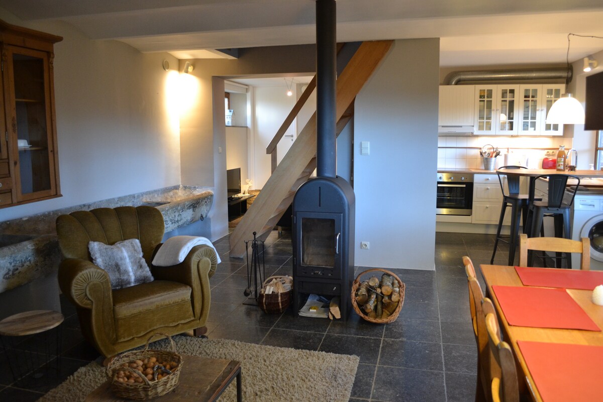 Exceptionellt modernt boende för ett par i den vackra Meuse-dalen, 15 minuter från Namur, 20 minuter från Dinant. Hängande panoramaterrass, fantastisk utsikt! Lugn och ro mitt i naturen. Fullt utrustat kök (ugn, induktionshäll, kylskåp, diskmaskin, vinkällare, porslin, Nespresso-maskin, brödrost, vattenkokare) Mysig atmosfär, liten vardagsrum, dubbelsidig gasspis. King size-säng. Badrum med dusch. Total avskildhet! Rökfritt boende.