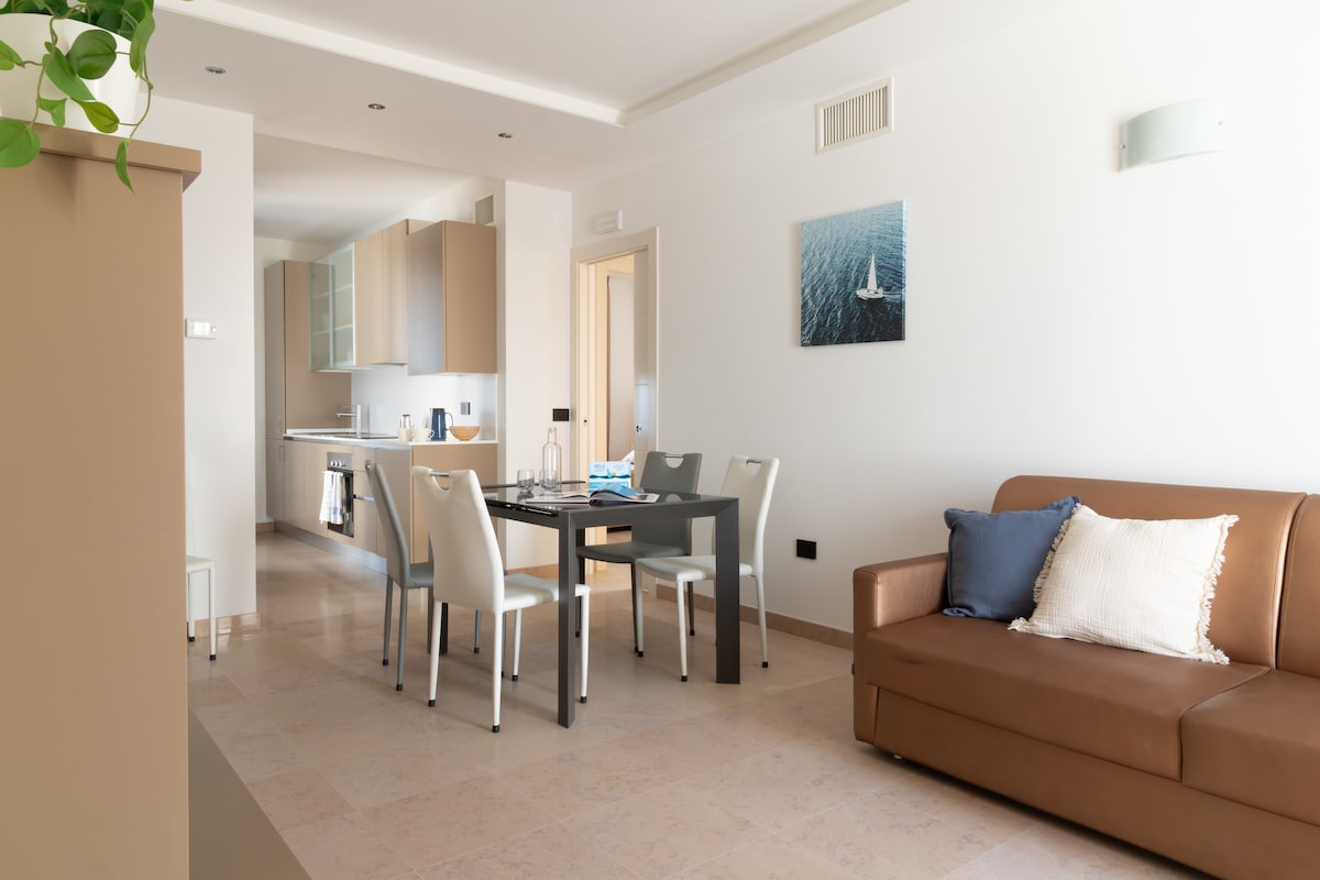 Appartamento a piano terra, in una palazzina a tre piani di recente costruzione in posizione centrale, sul lungomare pedonale. L'appartamento è accessibile sia dall'ingresso posteriore che dal lungomare ed è composto da due camere, cucina e soggiorno, bagno e un ampio patio dotato anche di doccia esterna. L'impianto di climatizzazione a pavimento offre un ambiente molto confortevole.