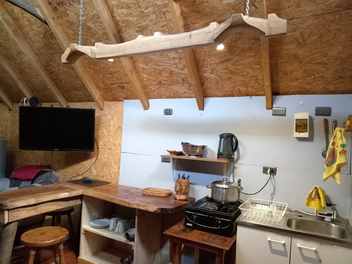 Koppla av på denna unika och lugna tillflyktsort. Inbäddad i den inhemska skogen, som i en saga, där du upplever naturen som en enhet och kan se stjärnorna och månen på natten från din säng ... om vädret tillåter. Njut av regnet och ibland snön i all sin prakt! Det har en privat badkar! Kärlet har ett separat värde (det ingår inte i värdet för stugan - kostar 40 000 $ per gång den används)