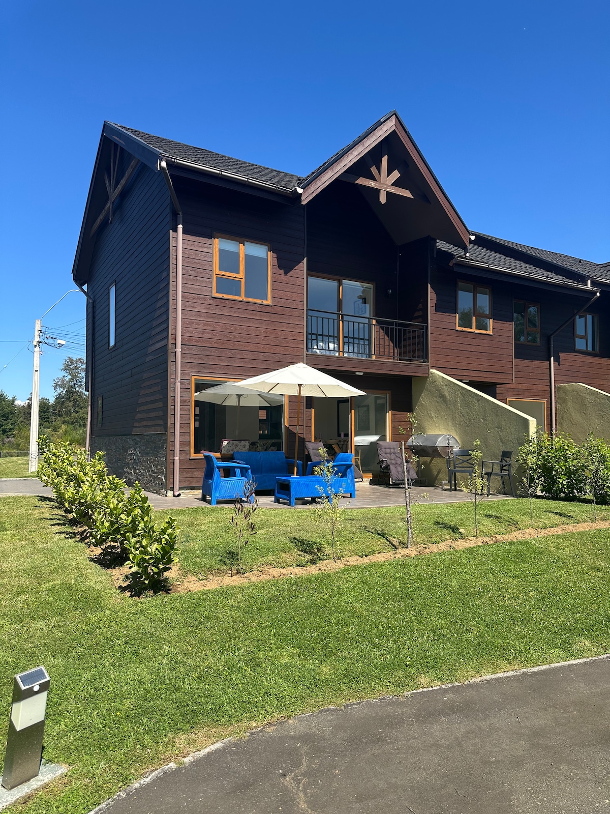 Casa nueva para huéspedes situada a las cercanías de lago Villarrica (app 5 minutos en auto), en barrio residencial seguro y tranquilo; cerca de supermercado, gasolinera y stripcenter La casa cuenta con cocina completamente equipada, 3 habitaciones, wifi, aire acondicionado, televisión con TV cable, 2 baños, quincho. Se admite 1 mascota.