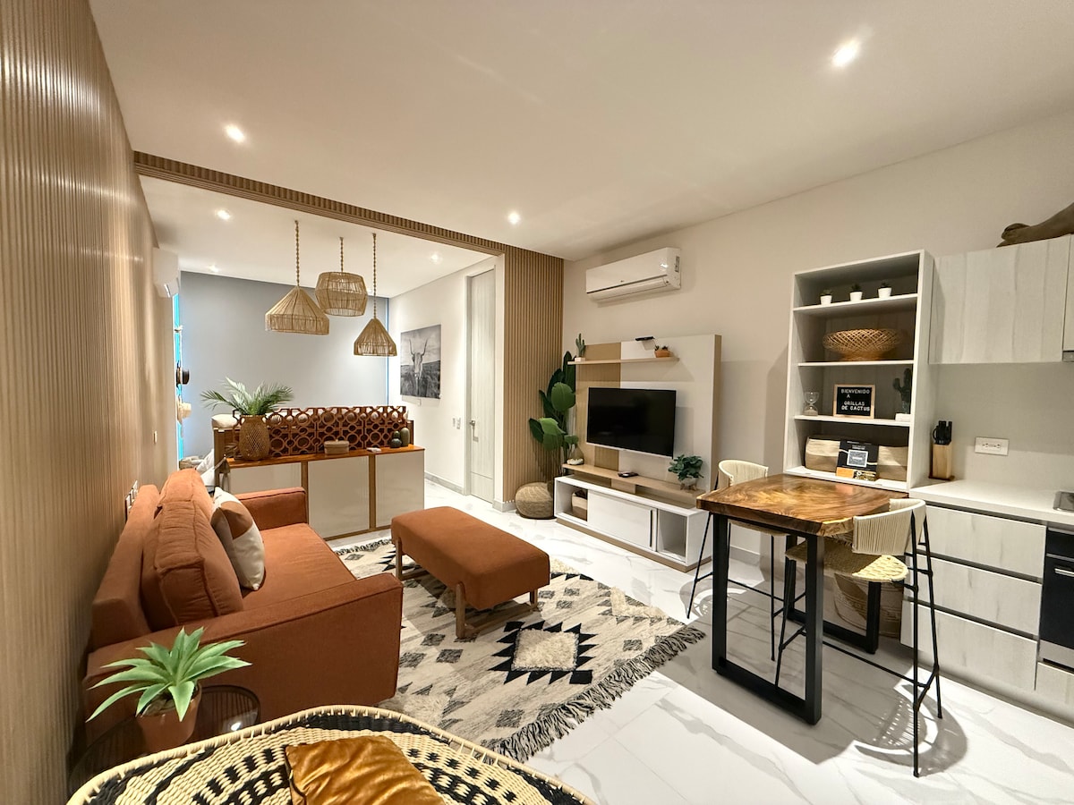 Vakna till havets ljud och njut av en lyxupplevelse i Santa Marta. 🌊 Denna lägenhet kombinerar komfort och stil med en spektakulär panoramautsikt över havet, utomhuspool och direkt tillgång till stranden. Det är den perfekta platsen för familjer, små grupper eller resenärer som vill koppla av med alla moderna bekvämligheter bara några minuter från staden. Dessutom kan du njuta av en restaurang i samma komplex med utsökt internationell mat. 🍴