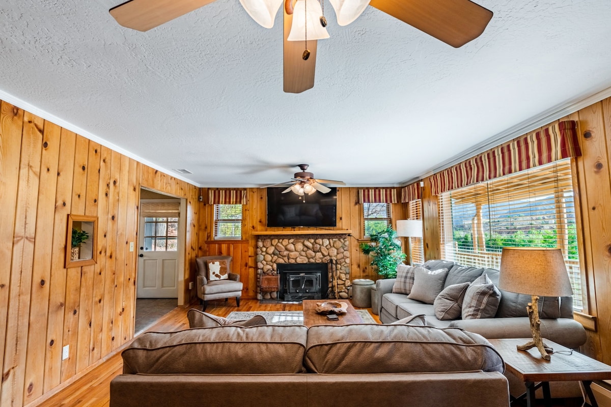 Vårt bergshem är perfekt för familjesammankomster, vänner och barn i alla åldrar! Denna unika stuga byggdes av en lokal skogshuggare och har en anpassad snidning av Paul Bunyan i vardagsrummet. Det ligger i södra änden av staden, ca. 5 minuter från historiska centrum. Forsränning, vandring, zipline, Royal Gorge ligger alla bara några minuter från denna bekväma vistelse. Helt inhägnad på bakgården så se till att packa dina väl uppfostrade hundar för din vistelse hos oss. Vi ses snart!