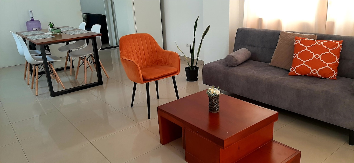 Två ljusa lägenheter med 5 sovrum med dubbelsäng, 4 kompletta badrum med kapacitet för upp till 11 personer och belägna i Puerto Ayora, nära Charles Darwin Station, Playa La Estación, Avenida Baltra och andra intressanta platser. Med utsikt över en park. BOENDE FÖR TURISTÄNDAMÅL. Den har en extra tjänst för HELT GRATIS STÄDNING AV LÄGENHETEN. (fråga efter tjänsten)