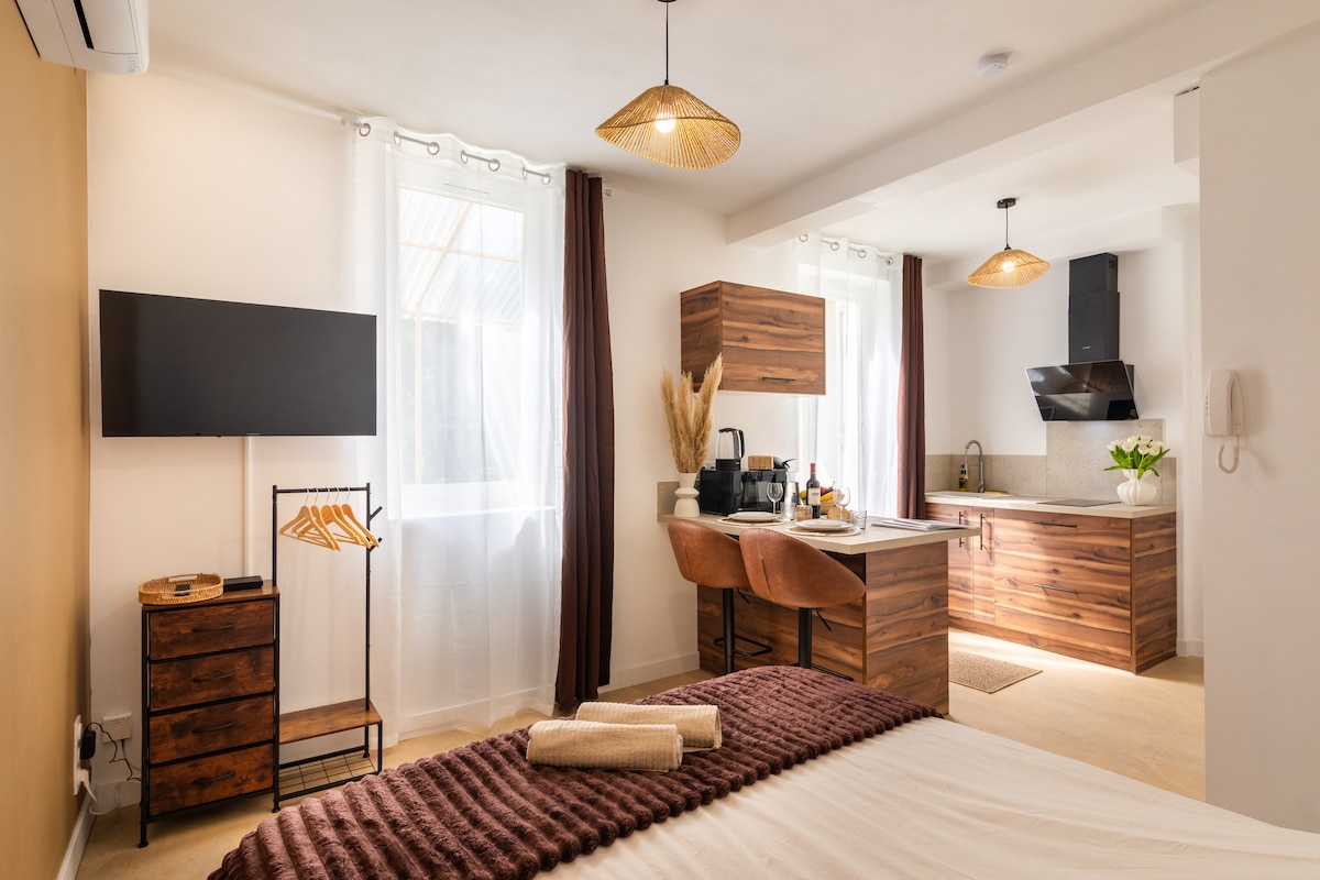 För din vistelse i Agen erbjuder vi denna bekväma lägenhet med en snygg och lugn inredning... Du kommer att uppskatta dess fantastiska bekvämligheter: dubbelsäng och sängkläder av hög kvalitet, samt en bäddsoffa som erbjuder en extra säng, fullt utrustat kök, TV, wifi, gratis parkering framför lägenheten. Direkt tillgång till den delvis täckta terrassen gör att du kan förlänga stunderna av avkoppling utomhus.