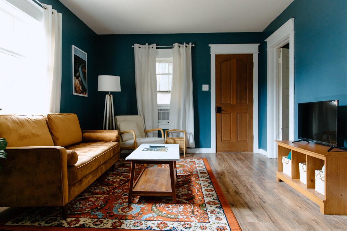 Helt nytt och fläckfritt rent! Utformad med din perfekta vistelse i åtanke, vi hoppas att du aldrig vill lämna. Beläget i ett pittoreskt historiskt grannskap intill centrum, är läget 2 minuter till centrum och UI. Njut av det lyxiga regnduschhuvudet, Cal King-sängen, det nya köket med fullstora apparater, luftkonditionering och matbordet eller arbetsytan. Koppla av i vardagsrummet fullt av naturligt ljus eller på vår lilla söderläge bakre däck med bord och stolar. Wifi och TV! Vi hoppas att du blir inspirerad!
