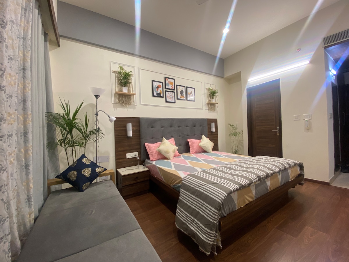 3 people sleep in this apartment, 2 on Main Bedroom and 1 on Sofa cum bed in entry Room. Good family or group friends stay in the city center of Chandigarh, VIP Road Zirakpur, Next to Panchkula Border, Just 10 mins drive from GMCH Hospital 32, 20 mins from Chandigarh’s PGI and Sector 16 Hospital. All cooking appliances with Induction. Cosmo Mall is just 5 mins walk away. Couple & Family friendly private 1BHK apartment with best RO water filter, most Expensive WakeFit Bodysence 10 Inch Mattress.