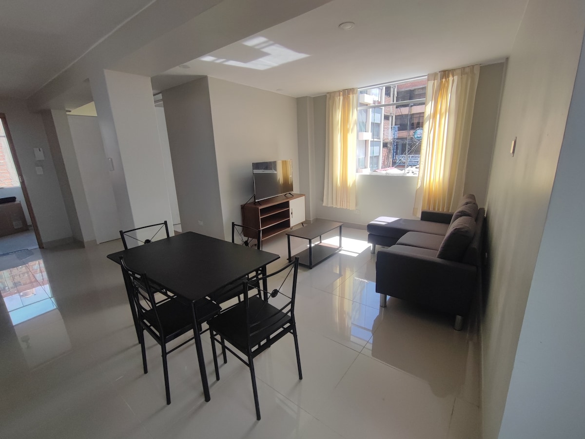 Moderno departamento en estreno a pocos metros de la plaza de armas, equipado completamente con todo lo necesario para que tengas una cómoda estadía en Puno. El departamento está ubicado en un 2do piso ubicado en el centro de la ciudad, zona segura a 2 minutos caminando de la plaza principal y de la calle principal de la ciudad, donde se encuentran los restaurantes y bares de la ciudad. El departamento tiene una cocina completamente equipada y cómodas camas, además de una amplia sala.