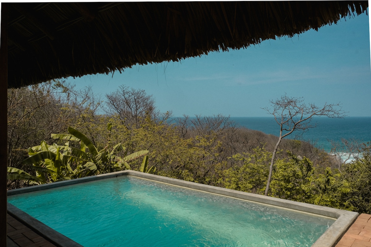Att vakna på detta ställe är en dröm! Huset ligger precis vid stranden av havet för att njuta av de bästa solnedgångarna varje dag. Den har två våningar. Sovrummet är längst upp samt arbetsytan (Starlink) och hängmattor för att vila. Taket är en bra palapa. Huset har en liten privat pool där du kan njuta av den bästa utsikten över Playa Mermejita. Huset är mycket öppet för att njuta av vindens fräsch och den bästa utsikten.
