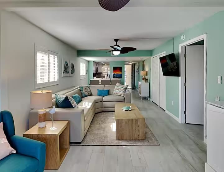 South Seas Beach Villa 2527 ligger direkt vid stranden. De vackra solnedgångarna över Mexikanska golfen, tillsammans med lägenhetspoolen kan ses från den privata lanai. Denna uppdaterade enhet har en dubbelsäng i sovrummet och en utdragbar bäddsoffa. Köket är fullt utrustat, det finns ett matbord inne och ute. Du får tillgång till stranden, poolen, pickleball, tennisbanor, strandstolar och handdukar och grillgrillar som ligger på framsidan av enheten.