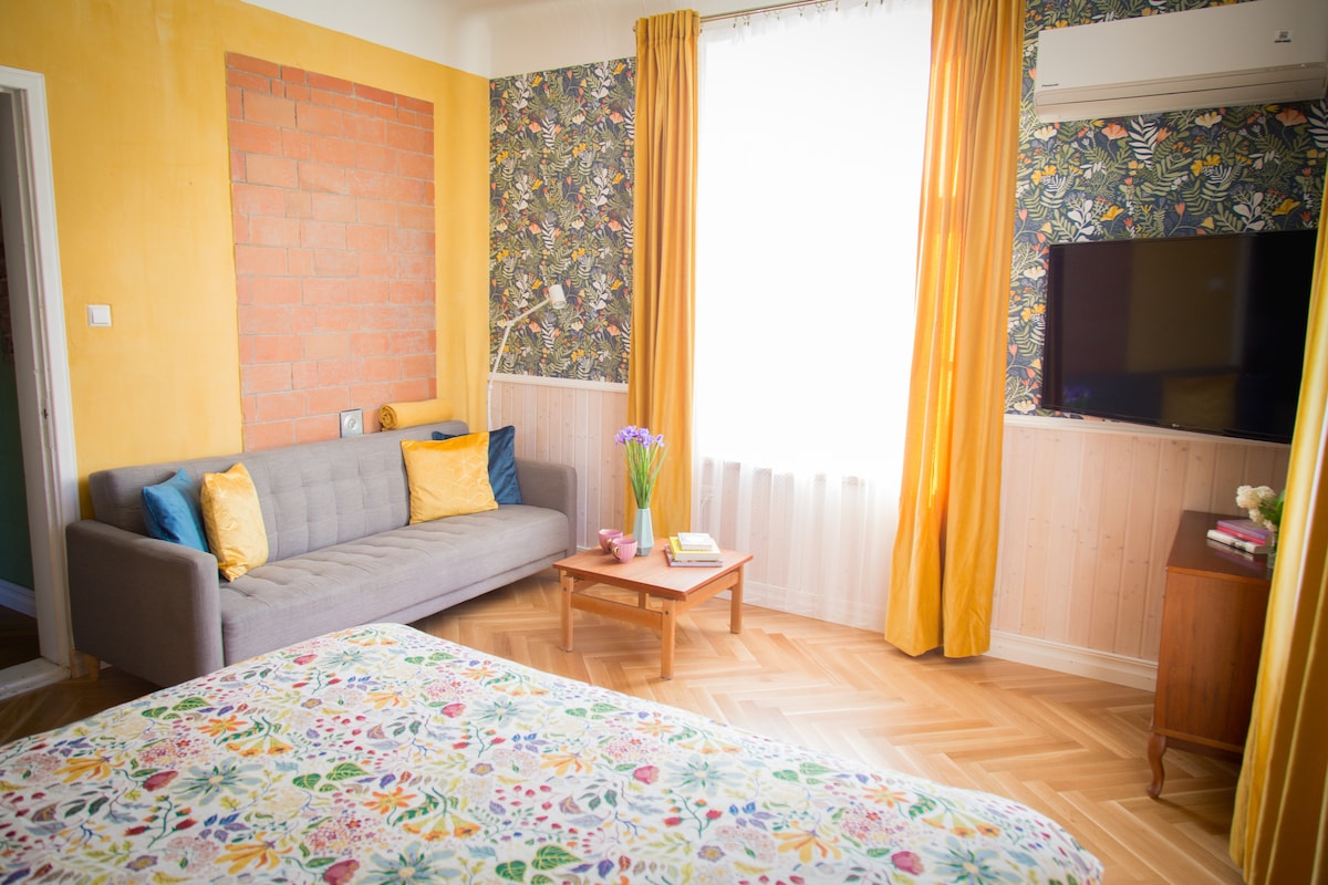 Ett hus byggt före 1909 och nyligen renoverat till tidigare glans. Lägenheten har mestadels renoverats av mig själv med traditionella metoder, eftersom den först byggdes för över 110 år sedan — trägolv, lerputsade väggar, välvda tak, naturfibrer och ekologiska ler- och kalkfärger. Lägenheten är lugn och full av solljus under de flesta timmar. Glädje för människor som älskar färger. Bekvämt för familjer/små grupper. Gratis parkering för en bil på tomten. Fyrbenta vänner är välkomna.