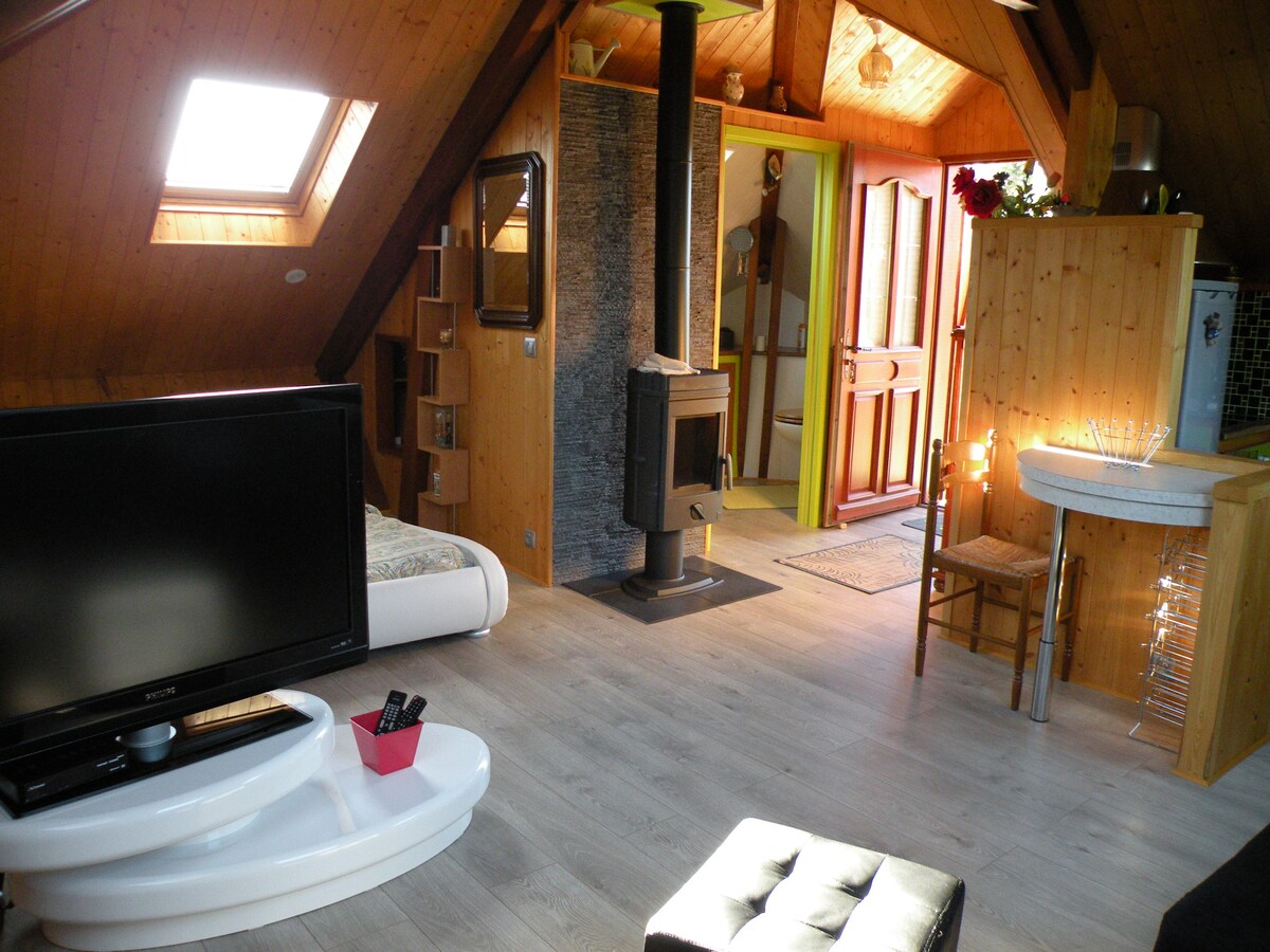 För en natt, en helg eller en vecka, kom och ladda batterierna i en varm trästuga, på stolpar och med alla bekvämligheter! Du kommer att njuta av en para-hotelltjänst, sängen (queen size) är bäddad, handdukar tillhandahålls, städning och desinfektion av rummet ingår. Det stora badkaret lovar dig stunder av avkoppling. Köksområdet gör att du kan vara självständig.