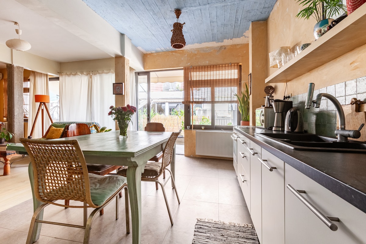 Bo mysigt i en liten studio på översta våningen. Kliv sedan ut på en takterrass med vidsträckt utsikt över berget Lycabettus och staden. Det är ett roligt och avslappnat utrymme med färgglada konstverk, vintageannonser, mattor och möbler. Fräscha upp dig i en rymlig dusch. En modern chic studiolägenhet med en mysig känsla, belägen i centrum av ett trendigt och urbant grannskap i hjärtat av centrala Aten. Det lilla huset på taket är perfekt för ett par, en liten familj eller en grupp vänner och är redo att tillgodose alla dina behov. Den är fullt utrustad med nya apparater och ett nytt kök, obegränsat wifi, en smart-TV (32 tum), luftkonditionering och en mycket rymlig dubbelsäng och en bekväm bäddsoffa. Allt du någonsin kan behöva för din perfekta semester. Lägenheten ligger i grannskapet Exarcheia, som är känt för sitt nattliv med många barer och pubar överallt och sin bohemiska och konstnärliga atmosfär. Det "lilla huset" är mycket nära till det historiska och turistiska centrum av Aten, bara 15 minuters promenad (med en hel del sevärdheter däremellan) till Monastiraki torget, det verkliga centrum av turistattraktion. Men om du inte är angelägen om att gå, närmaste tunnelbanestation (Panepistimio) är bara sju minuter från huset och kan ansluta dig till överallt du kan tänkas vilja gå. Nära Panepistimio finns hållplatserna Syntagma (1 hållplats), Akropoli (2 hållplatser) och Monastiraki (2 hållplatser, 1 linjebyte). Med en avgift på 20 euro (motsvarande tunnelbanemässan för 2 personer), och efter överenskommelse, är jag tillgänglig för att hämta dig från flygplatsen vid din ankomst och köra dig till lägenheten om du önskar. Gäster har tillgång till hela studion. Efter kommunikation kommer jag att träffa dig för att eskortera dig till lägenheten och ge dig den nödvändiga information du behöver om transport, de bästa turistplatserna och för att svara på alla dina frågor. Från och med då kommer jag att vara tillgänglig via telefon, viber eller w-app för att hjälpa dig med allt du behöver. Lägenheten ligger i grannskapet Exarcheia, känt för sitt nattliv och bohemiska atmosfär. Det ligger nära det historiska och turistiska centrum i Aten, och ligger 15 minuters promenad till Monastiraki Square.