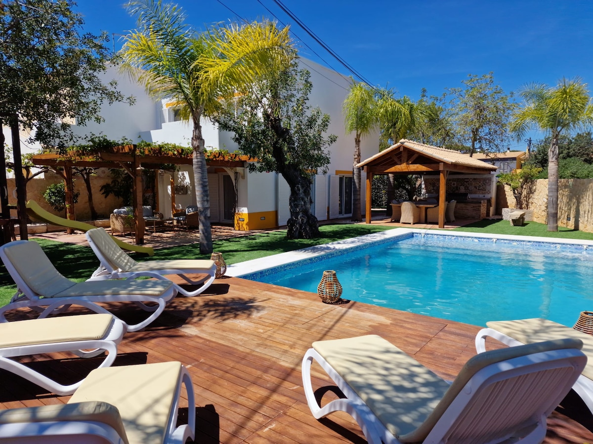 Vår vackra, fullt luftkonditionerade 4 bädds villa med trädgårdar, pool och grill ligger i Vale de Para bara 1,8 km från de blå flaggstränderna i Galé med en olivlund på ena sidan och vingårdar på den andra men i närheten finns det många fina restauranger, butiker och stormarknader inom gångavstånd. Den gamla staden Albufeira ligger bara 10 minuters bilresa bort. I närheten finns även Algarve Shopping mall (superstore & cinema) bara 6 km, och golfbanan Salgados. Städservice och poolvärme finns tillgängliga