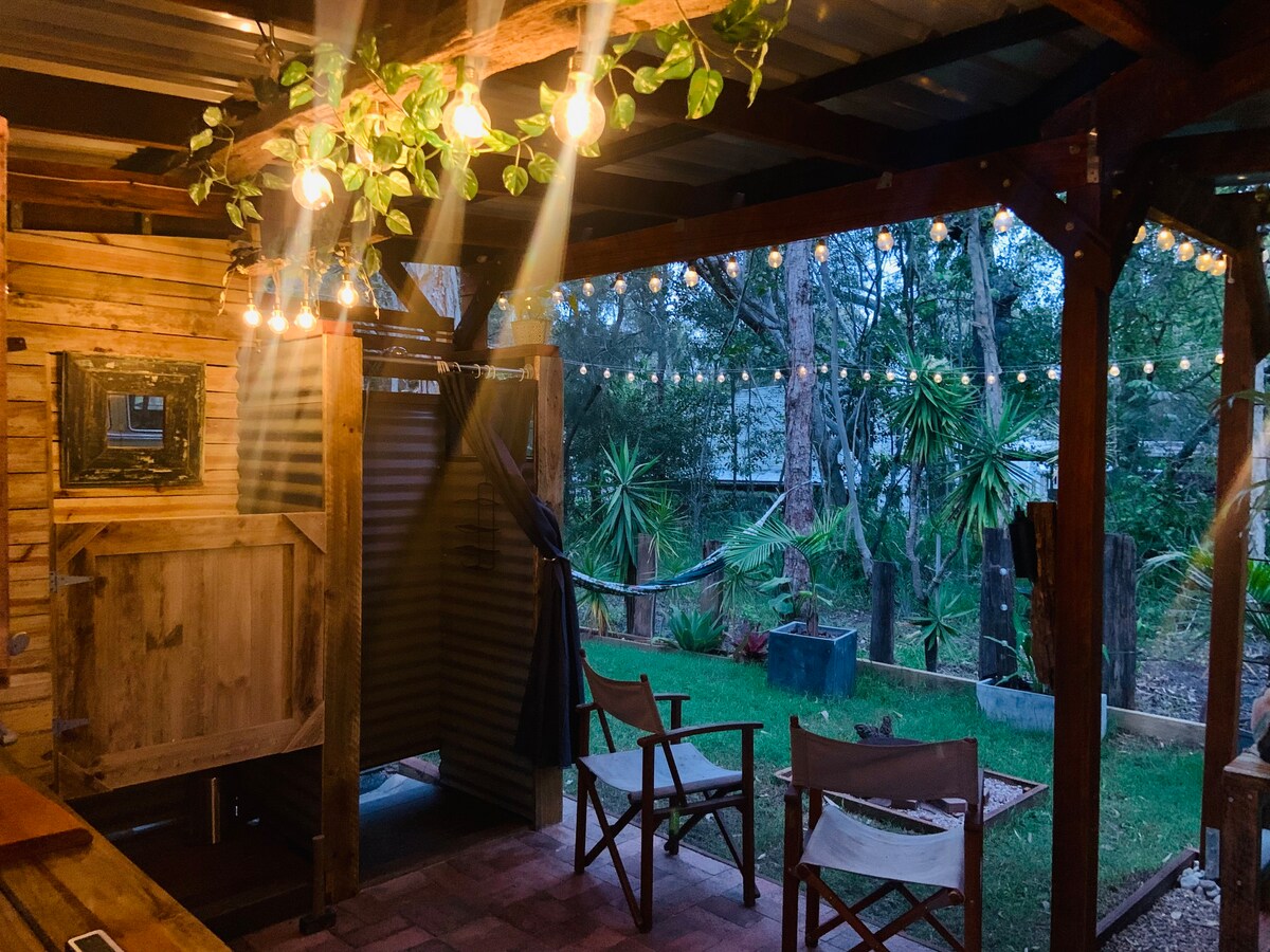 Denna unika naturfokuserade bostad har en avslappnad känsla, nära Byron stad (endast 13 km) men tillräckligt långt bort, för en förändring av takten och en paus i ett överflöd av vacker natur. Den har ett stort djupt badkar, tillräckligt stort för 2 (under tak) på ett däck med en vacker naturutsikt och ett avkopplande semi-utomhus vardagsrum med skåpbilen som sovrum med A/C. Njut av den ensamhet som inlandet erbjuder, med vidöppen frisk luft utan att se någon annan än kängurur, koalor och fåglar.