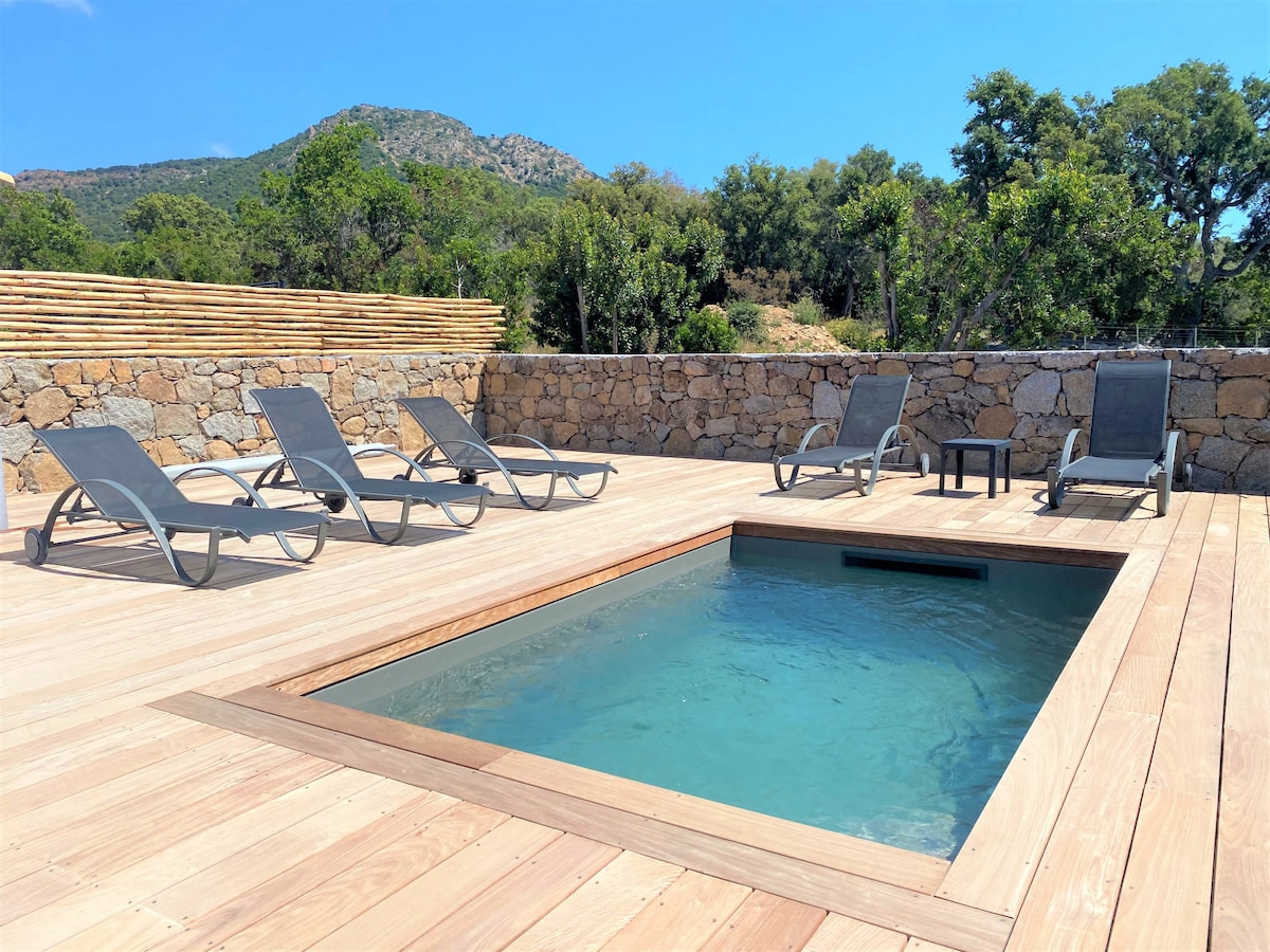 Traditionellt korsikanskt hus inspirerat av gamla fårfållor i sten och trä. Modern komfort och uppvärmd pool i hjärtat av maquis. Lugn, utsikt över bergen. Denna "Caseddu" på 40 m2 består av ett vardagsrum med kök, vardagsrum och öppen spis och ett sovrum med badrum och separat toalett. Utrustad med diskret utrustning, ger den all nödvändig modern komfort. Utanför erbjuder träterrassen och den uppvärmda poolen (10 m2) en fantastisk utsikt över bergen.
