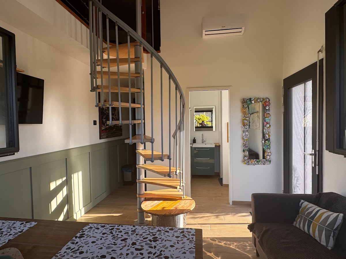 Nous sommes heureux de vous proposer notre Studio de 25 m2 (15 m2 espace au sol) et (10 M2 de mezzanine - Hauteux max 1M68, min 1M55). Escalier colimaçon - climatisation Avec entrée extérieure indépendante, SDB privative, douche à l'italienne, wc, kitchenette équipée bouilloire, micro-ondes, plaques, cafetière senseo,TV, canapé, terrasse privative ... Literie 180cm x 200 cm. DRAPS FOURNIS - SERVIETTES NON FOURNIES Arrivée à 17h. Départ à 11H au plus tard Au plaisir de vous rencontrer.