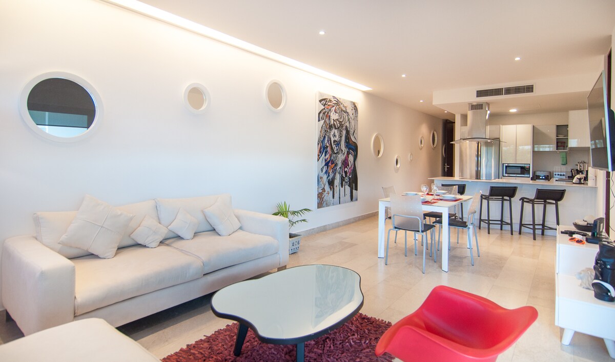 Ny lägenhet med 2 sovrum i en lyxig ny byggnad bara några steg från stranden och 2 kvarter ner från 5th Ave. Omgiven av en Manglar och träd är denna lägenhet perfekt för din semester, verkligen lugn gata även om du bara är meter från alla restauranger, barer och strandklubbar i Playa del Carmen, vilket gör detta till ett perfekt läge att röra sig och fortfarande ha en lugn och bra sömn. Kolla in den fantastiska poolen på taket cuna y silla de bebé sujeto a disponibilidad.