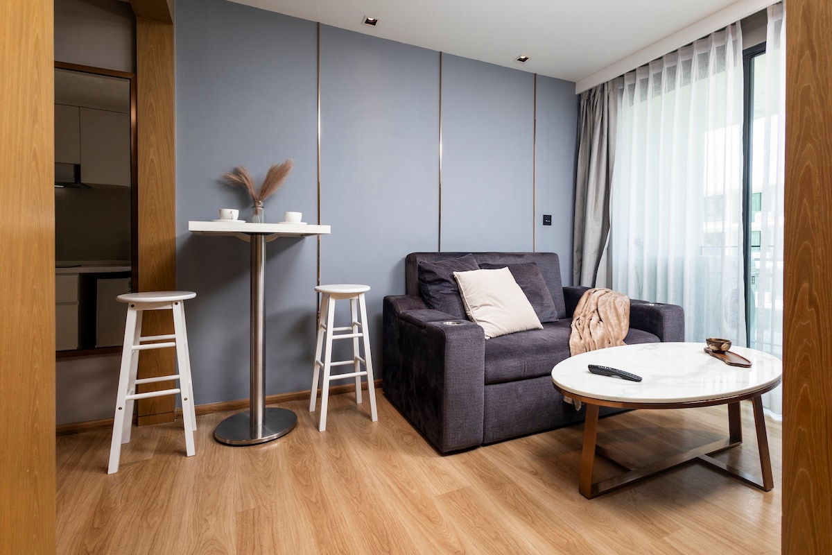 Modern 36 kvadratmeter lägenhet på fjärde våningen med utsikt över poolen och palmer i The Title V ✅ Allt inkluderat. Inga dolda avgifter. Allmännyttiga tjänster ingår i priset. ✅Bara 5 minuter med bil till stränderna i Nai Harn och Yanui. Kaféer, restauranger, stormarknader och kontorsdelning ligger inom gångavstånd. ✅Njut av livet i ett komplex med 3 simbassänger, en hamam, ett modernt gym och egen parkering. Du behöver inte gå någonstans för att få en fullständig vila!