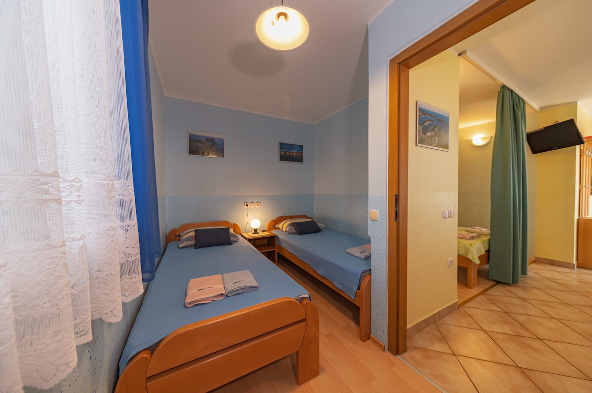 Rymligt, stort rum med egen balkong och utsikt mot trädgården, bara 30 meter från stranden. Det är idealiskt för familjer eftersom det rymmer upp till två barnsängar (gratis) och/eller en extrasäng (på begäran, mot en extra avgift). Rummet har ett eget badrum, en fläkt, gratis Wi-Fi och säker parkering. Gäster har tillgång till en trädgård och en frukosthörna, och en lugn 15 minuters promenad längs havet leder till gamla stan i Rab. Den perfekta platsen för en avkopplande och bekväm semester. Njut av detta bekväma boende med din familj.