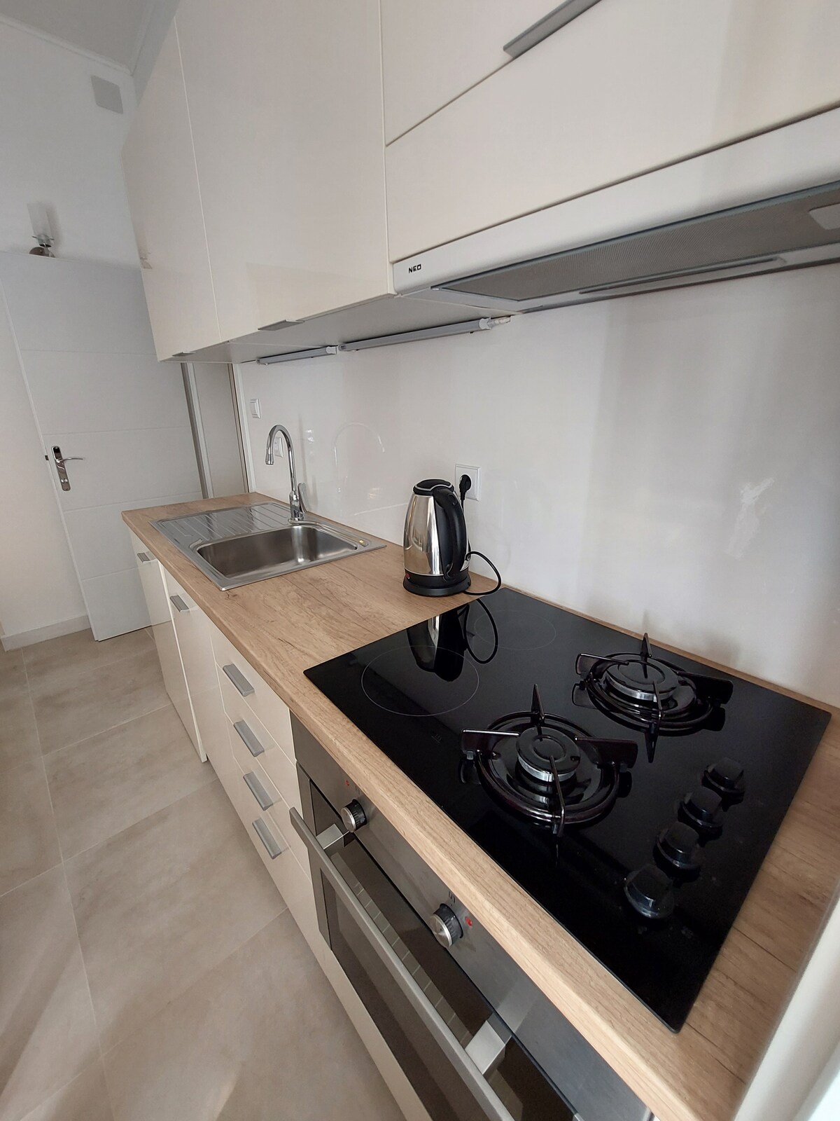 Den 60 m 2 lägenheten består av ett sovrum med en stor dubbelsäng, ett badrum, ett rymligt vardagsrum med ett kök, ett förrum och en balkong. Hela den södra väggen mot havet, som är glasigt glas så utrymmet är ljust, och med balkong gör det en plats. Lägenheten ligger på tredje våningen i huset, mycket nära stadens centrum (5 minuters trevlig promenad vid havet), och den har en balkong med öppen utsikt över havet och öarna, eftersom huset ligger i första raden vid havet.