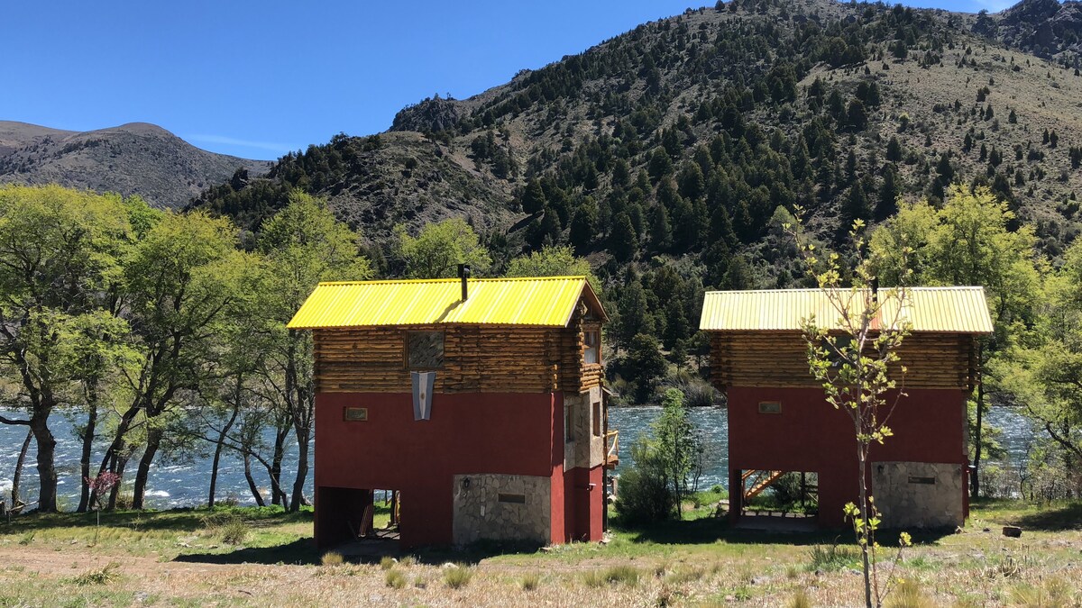 Boende för 4 personer i 2 parhus stugor. Beläget på stranden av Aluminé River i Pilolil. 25 tunnland och 1200 meter privat strandlinje + 200 meter sandstrand. Total avskildhet. Stuga 1: Ett sovrum: 2 enkelsängar, kök-matrum, litet vardagsrum och badrum. Stuga 2: två sovrum, kök matsal, badrum. Däck och trädgårdsmöbler. Chapelco flygplats 45 miles, Junín de los Andes 30 miles. San Martin de los Andes 65 mil. Tillgång via fullt asfalterad Route 23. Flygfiskare välkomna