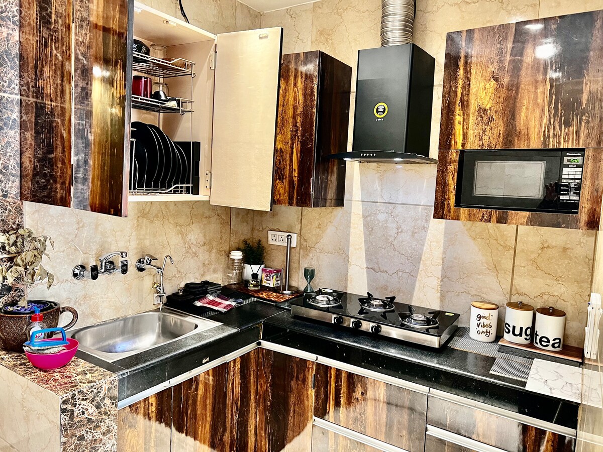 Newly Constructed, fully furnished 3 BHK (2 BHK + 1 Living Room or 1 BHK) with Balcony, Free Wi-Fi, Free Parking, Park and Sun Facing, Split A/C's, Washing Machine, Microwave, RO System - Free Mineral Water available for drinking and Cooking, Refrigerator, Modular Kitchen, Ultra Modern bath Fittings, Iron, Modern wardrobes, uPVC Sliders, Led TV, Smart Door Lock.