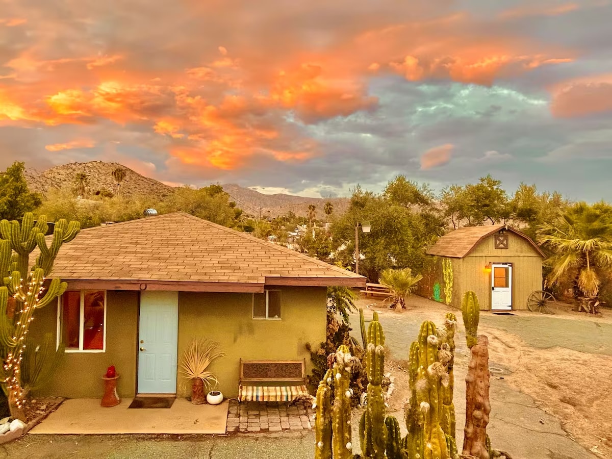 Inbäddad i en liten vik ligger vår privata stuga med studio och eget badrum. Det är 5 minuter till STADEN och den berömda LINBANAN; 15 minuter till CENTRUM. En miniglampingdestination inbäddad i utkanten av San Jacinto-bergen. Omgivningen känns som om du tältar på en fridfull campingplats eller en dammig ol' west ranch bergsamhälle. Inte för de lyxiga: det är gjort för PRISVÄRDA resenärer, studenter och REI-vandrare. Denna studiolägenhet ligger på en husvagnspark. Tillgång till vårt populära PS gemensamma hem ingår.